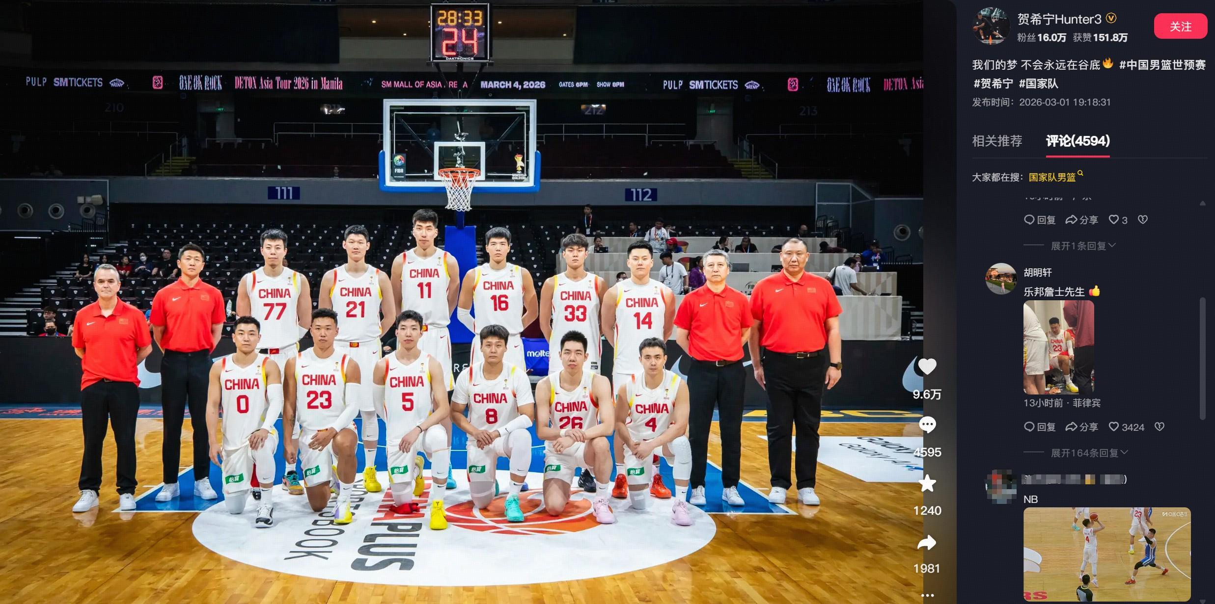 贺希宁本场比赛表现出色,首发登场20分钟得到10分1板1助,赛后,球员在社媒分享赛前大合影庆祝胜利。